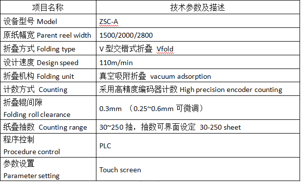 設備主要參數: 1.核心技術已取得多項國家專利; 2.生產速(sù)度100米/分,分疊10條/分; 3.自動化程(chéng)度高,省人工,分紙整齊; 4.PLC控製的伺服係統(tǒng)完(wán)成自動分疊; 5.自動設定分疊抽(chōu)數,精度100%準(zhǔn)確;