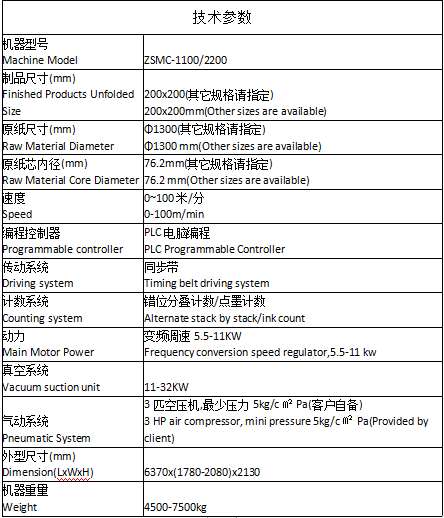 ZSMC-1100/2200型麵巾紙(zhǐ)機采用PIC電腦編程技術,變頻調速,及配置有觸摸式人機界麵操作係統,自主研發了遠(yuǎn)程通訊服務係統,可隨時監控(kòng)機械的運作情況;整機來用獨立傳動,設備適合多種原紙的需要,極大地提(tí)高了品質和效率。 主要特點 1、配置(zhì)氣動式鋼對鋼壓花,氣動式分離; 2、退紙架(jià)采(cǎi)用氣動上紙、無級(jí)調節速比,調整不同紙質張力; 3、采用羅茨真空泵吸(xī)附係統,吸氣量大,運行穩定; 4、可根據需要折(shé)疊不(bú)同寬度的成品,可選(xuǎn)用點切(qiē)或全切; 5、配置鋼(gāng)對鋼壓紋裝置,確保雙層麵巾紙不分層; 6、可(kě)根據需要配置原紙對齊功能(néng); 7、斷紙自動停機係統,避免無紙或斷紙產生廢品; 8、采用前後點動開關牽引原紙,操作更簡便、更安(ān)全(quán);