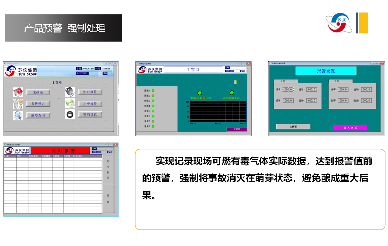 通過現(xiàn)場可燃/有毒氣體探測器,現場裝置某(mǒu)區域,安裝位置(zhì)相對集中12路氣體檢測器,信息輸入本係統裝置。智能區域報警器控製(zhì)裝置安裝在主要通道邊上或該區域四周(zhōu)及車(chē)間和中控室(shì)外圍,當現場氣體濃度超(chāo)時,該裝置二級報(bào)警,第一時(shí)間快速讓現場工作人員訊速撤離。同(tóng)時可推(tuī)送手機終(zhōng)端報警。有效控製(zhì)事故的發生,保護了人生安全。